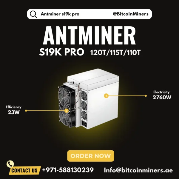 Antminer S19k Pro is an energy-efficient SHA-256 ASIC miner delivering hash rates of 120, 115, and 110 Th/s with a power consumption of 2,760 W and an efficiency of 23 J/Th. Designed for stable and reliable Bitcoin (BTC) and Bitcoin Cash (BCH) mining, it is ideal for professional miners and mining farms seeking consistent long-term performance.