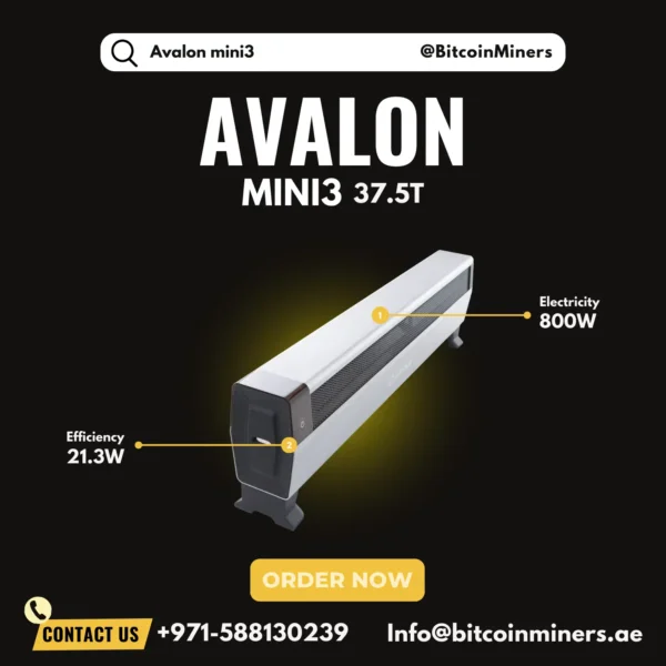 Avalon Mini3 is a high-performance SHA-256 ASIC miner delivering a hash rate of 37.5 Th/s with a power consumption of 800 W and an efficiency of 21.3 J/Th. Designed for stable and efficient mining operations, it is ideal for both small-scale miners and enthusiasts seeking reliable long-term performance.